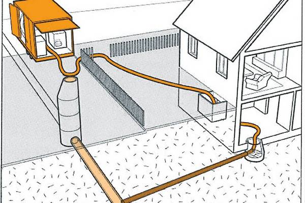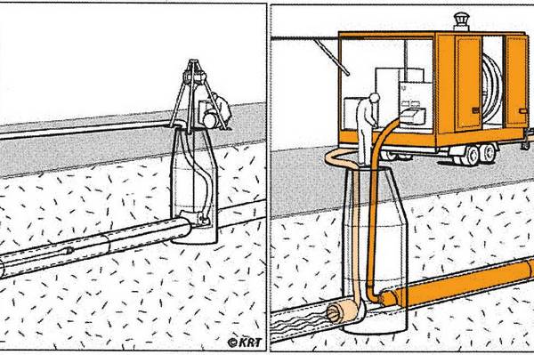 Ein mit Epoxidharz getränkter Schlauch wird über eine Leitungsöffnung mit einer Umstülpanlage in den zu saniererenden Leitungsabschnitt eingeblasen.